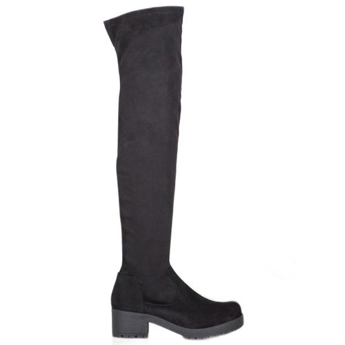 Czarne zamszowe kozaki damskie za kolano. Buty umieszczone są na 2-centymetrowej platformie, która wraz z szerokim obcasem ma 5,5 cm. Na dole znajduje się syntetyczna podeszwa z bieżnikiem. Z boku cholewki zamontowany został ułatwiający zakładanie kozaków zamek błyskawiczny. Przód butów jest zaokrąglony i lekko uniesiony.