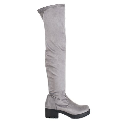 Sięgające za kolano damskie buty z ekologicznego zamszu w kolorze szarym z efektem błyszczenia. Na górze kołnierza oraz na przegubie znajdują się delikatne ozdobne przeszycia. Elementem dekoracyjnym są również zaokrąglone noski. Całość umieszczona jest na czarnej 3-centymetrowej platformie zakończonej pod piętą szerokim obcasem.