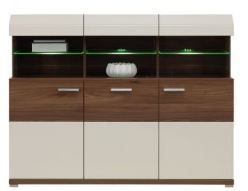 Duży kredens Moka to nasza propozycja do nowoczesnej jadalni. Kredens posiada troje drzwiczek z mechanizmem cichego domyku w komplecie. Poziome przeszklenie pozwoli na wyeksponowanie ulubionych przedmiotów.Podświetlenie led w standardzie WYMIARY:szerokośc: 149cmgłębokość: 40 cmwysokość: 114,5 cm PRODUKT DO SAMODZIELNEGO MONTAŻU. KOLOR: beż połysk-wiśnia