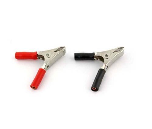 Para (czerwony i czarny) "twardych" krokodylków zaciskowych. Dodatkowo w jednej z odnóg, zaciski posiadają 4 mm gniazdo do użycia np. wtyków bananowych.