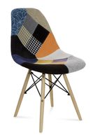 Eleganckie, proste krzesło o nowoczesnej formie, tapicerowane. Świetnie wyprofilowane siedzisko krzesła wykonane z wytrzymałego polipropylenu tapicerowane tkaniną tworzącą niepospolity wzór, złożony z materiałów o niepospolitym designie. Stelaż 4 nogi z drewna bukowego połączone elementami czarnego metalu. Kolor patchwork/buk