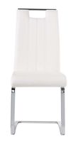 Nowoczesne i eleganckie krzesło tapicerowane skórą ekologiczną. Dekoracyjne szycie dodaje dodatkowego uroku. U góry krzesła chromowany uchwyt ułatwia przestawianie krzesła. Stelaż metalowy. Kolor biały/chrom To idealne krzesło które swoje miejsce znajdzie w jadalni przy wspólnych posiłkach. Swoją prostotą zachwyci najbardziej wymagających klientów.