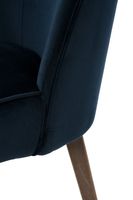 Granatowe krzesło Dean o wymiarach 49x65x80cm. Siedzisko z delikatnie wygiętym oparciem, zostały wykonane z miękkiego weluru w kolorze granatowym. Zastosowana tkanina jest niezwykle wygodna i łatwa w konserwacji, co nie jest bez znaczenia przy często użytkowanych krzesłach. Nogi krzesła zostały wykonane z drewna w brązowym kolorze, a ustawienie ich pod kątem, dodaje meblowi uroku. Krzesło Dean to kwintesensja wygody, komfortu i niewymuszonej nowoczesności.