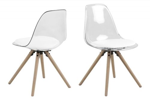 Krzesło Henning to idealna równowaga połączenia drewna z tworzywem. Siedzisko wykonane z transparentnego tworzywa umiejętnie zostało połączone z poduszką wykonaną z ekoskóry w kolorze białym z matowym wykończeniem. Podstawa wykonana z drewna dębowego została dodatkowo olejowana dzięki czemu walory drewna zostały uwydatnione.