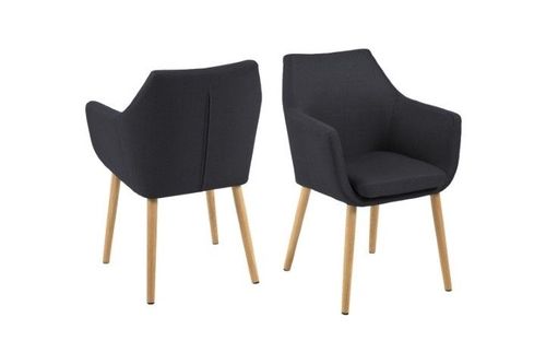 Krzesło Nora Antracyt nawiązuje do kolorystyki wpisującej się w trendy designu. Siedzisko tapicerowane tkaniną o grubym splocie efektownie komponuje się z podstawą wykonaną z drewna dębowego, dodatkowo zabezpieczoną warstwą lakieru chroniącego drewno przed drobnymi uszkodzeniami.