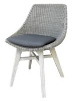 Klasyczne krzesło ogrodowe Clifton o lekkiej, lekko zaokrąglonej formie i wymiarach: 56x54x82cm. Podstawa krzesła i nogi zostały wykonane z szarego, patynowego drewna tekowego odpornego na warunki atmosferyczne. Zaokrąglone, plecione oparcie w białym kolorze zostało wykonane z odpornego na promieniowanie UV i deszcze ekorattanu (technorattanu). Wygody w krześle dodaje miękka, szara poduszka w szarym kolorze. Krzesło idealnie pasuje do aranżacji ze stołem obiadowym Clifton.