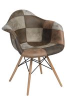 Patchworkowa wersja krzesła P018W. Małe kawałki materiału o podobnych kształtach tworzą siedzisko krzesła. Podstawa wykonana jest z drewna bukowego.