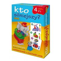 "Kto silniejszy?" to matematyka na wesoło, która zawiera w sobie cechy najcelniej trafiające w gust najmłodszych. Dzięki formie zabawy umożliwia zgłębianie tajników matematyki w sposób najbardziej dla nich przyjazny i atrakcyjny. Zestaw zawiera 48 plakietek z postaciami zwierzątek, którym przypisana jest siła w liczbach od 1 do 12, oraz ich graficzne odzwierciedlenie w postaci diagramów, złożonych z kolorowych kwadracików.Dzieci mogą odczytywać siłę zwierzątka, poprzez porównywanie wysokości diagramów, lub dodając poszczególne kwadraciki budujące diagram. Taka możliwość sprawia, że bawić się w nią mogą również ci najmłodsi, którzy nie rozpoznają jeszcze cyfr. Zabawa Kto silniejszy bazuje na zasadach klasycznej gry wojna.To wspaniała rozrywką dla dzieci już od czwartego roku życia.Zestaw gry zawiera:- 48 plakietek z postaciami zwierzątek.