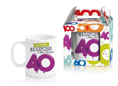 Ten kubek z pewnością przypadnie do gustu każdemu jubilatowi!Gadżet w szczegółach:wykonany z wysokiej jakości porcelanyidealny prezent na urodzinyzapakowany w kolorowe pudełeczko z uchwytempojemność: 300 mlmożna używać w zmywarce i mikrofalówcewymiary: 9,5 x 8 x 8 cmopakowanie: 13 x 11,5 x 8,5 cm.