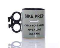 Uwaga! Rozpoczęcie sezonu. Zaczynamy od przeglądu: - Sprawdzić śrubki - ZROBIONE! - Nasmarować - ZROBIONE! - Zasuwać - ROBI SIĘ! Kiedy pojazd jest sprawdzony rusza sezon rowerowy! ceramiczny kubek z rączką w kształcie roweru na kubku napis: Przegląd roweru: Sprawdzanie śrubek, smarowanie, ostra jazda - napis w języku angielskim ozdobne opakowanie