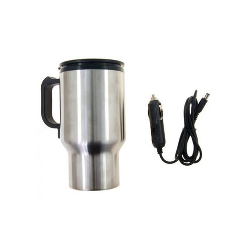 Kubek posiada wbudowaną grzałke, zasilany z wtyczki samochodowej 12V podłaczonej do gniazda zapalniczki. Towar wykonany z polerowanej stali nierdzewnej INOX. Kubek posiada podwójne ścianki z komorą próżniową oraz wkładem plastikowym zamyka go szczelna plastikowa przykrywka z przesuwnym zaworkiem, ktory zabezpiecza zawartość przed rozlaniem. Kubki posiadaja wygodne w trzymaniu plastikowe uszko, oraz kabel o długośći po rozciagnieciu ok 100cm. - Materiał: stal nierdzewna oraz plastik. - Pojemność 400ml. - Wymiary: 16x8,5cm. Idealny do samochodu.