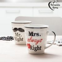 Zaskocz swoją drugą połówkę kubkami Mr. Right & Mrs. Always Right! Te ceramiczne kubki są idealne na romantyczny prezent. Zestaw zawiera 2 kubki (Mr y Mrs). Wymiary (wysokość x średnica): ok. 9,5 x 8,5 cm. Pojemność: 250 ml.