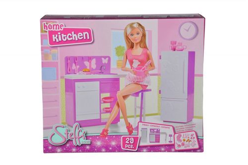 Zestaw zawiera lodówkę, kuchenkę, taboret i około 29 akcesoriów