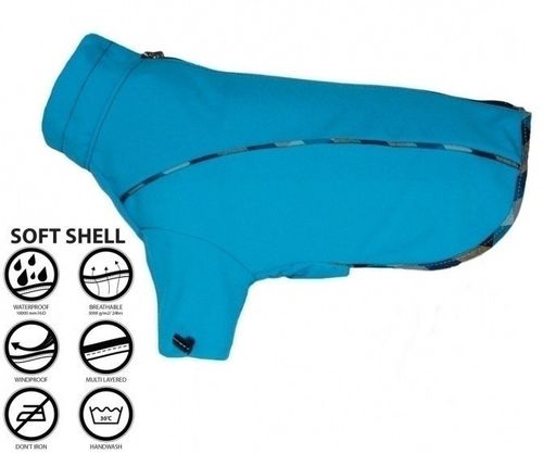 Kurtka z soft shellu trójwarstwowego, nie przepuszcza wiatru, wodoodporność 10000mmH2O, paroprzepuszczalnoąść 3000 g/m2/24h. Kolor niebieski, wypustka w cięciu bocznym i lamówka w kratkę pasująca do kolekcji HOSTA, rękaw przedni, wysoka stójka, zapięcie na zamek błyskawiczny na plecach. Regulacja tęgości w pasie i przy szyi. Miękka lekka ciepła i wygodna.