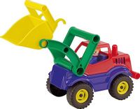 Kolorowa koparko spycharka o długości 27 cm, wykonana z elestycznego plastiku wysokiej jakości, spełniającego normy europejskie. Funkcjonalne autko, łyżką można nakładać piasek na wywrotkę lub przesuwać w inne miejsce.