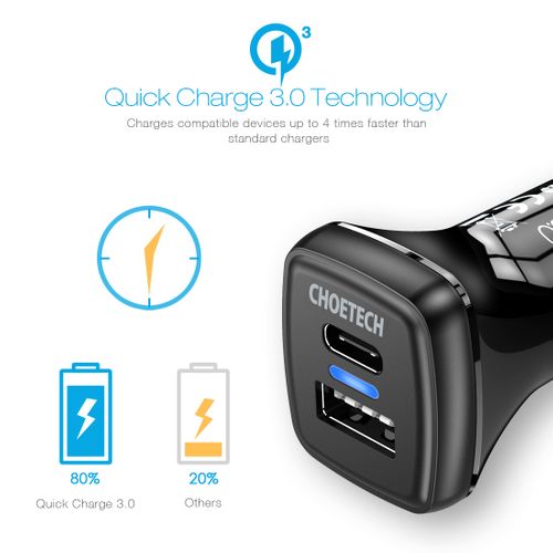 Wysokiej jakości ładowarka samochodowa, która obsługuje technologie szybkiego ładowania Qualcomm Quick Charge 3.0. Posiada jedno wejście USB-A i jedno wejście USB-C, co pozwala na jeszcze szybsze ładowanie urządzeń wyposażonych w gniazdo USB-C. Ładowarka automatycznie dopasowuje optymalne parametry ładowania. W pełni zabezpieczona przed przegrzaniem, zwarciem i tym podobne. Kompaktowe wymiary pozwalają łatwo dopasować ładowarkę do wnętrza auta.