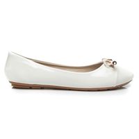 Lakierowane, śnieżnobiałe balerinki z uroczą kokardką z przodu i złotymi detalami. Fantastyczna opcja na wyjście lub imprezę, kiedy nie chcesz męczyć się w szpilkach. Buty są eleganckie i bardzo stylowe, a przy tym wygodne, za sprawą zupełnie płaskiej podeszwy. Zapiętek jest zabudowany, ale dosyć miękki.