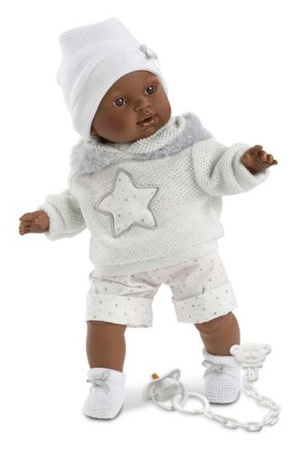 Śliczna lalka, kształtem i mimiką do złudzenia przypomina niemowlę. Każda mała dziewczynka będzie zachwycona lalkami firmy Llorens z uwagi na dbałość o szczegóły oraz wysoką jakoś wykonania.Lalka została wykonana z przyjemnego w dotyku winylu, brzuszek wypełniony jest miękką wyściółką, a ubranka uszyte są z wysokiej jakości materiałów. Kończyny oraz głowa poruszają się wokół własnej osi, a oczy są na stałe otwarte. Po wyjęciu smoczka z buzi bobas zapłacze i zawoła: mama, papa! Funkcje te można całkowicie wyłączyć.Główkę naszej lali zdobi biała czapeczka. Sirham ubrana jest w biały sweterek z gwiazdą z przodu oraz kapturkiem, krótkie spodenki oraz skarpetki pasujące do kompletu.Ubranko można zdejmować.Do lalki dołączony jest smoczek, który nie pełni tylko funkcji dekoracyjnej, ale również uruchamia moduł płaczu.Lalka zapakowana jest w kartonowe pudełko, idealne na prezent.Długość całkowita to 38 cm.