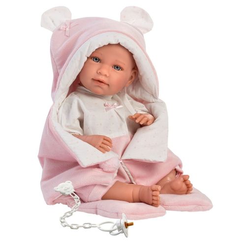 Lalka płacząca Mimi 42 cm została wyprodukowana w Hiszpanii przez znaną markę Llorens. Jest to zabawka dla dzieci w każdym wieku. Okrągłe policzki, długie rzęsy i urocze fałdki sprawiają, że lalka wygląda bardzo realistycznie. Lalka posiada ruchome, winylowe rączki, nóżki i główkę. Brzuszek lalki został wykonany z materiału i wypełniony miękką wyściółką. Po naciśnięciu na brzuszek lalka zapłacze i powie mama, papa, jak prawdziwe dziecko. Częścią zestawu jest mięciutki różowy kombinezon dla lalki z kapturem z uszkami misia, bawełniana pieluszka oraz ozdobny smoczek. Kochamy hiszpańskie lalki Llorens!