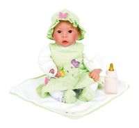 Lalka dla dzieci - Katrin może stać się ukochaną zabawką Twojego dziecka. Jest pięknie wykonana i do złudzenia przypomina prawdziwe niemowlę. Każde dziecko będzie nią zachwycone. Zobaczcie, jej szklane oczka i przyklejone rzęsy wyglądają bardzo realistycznie. Laleczkę ubrano w śliczne biało-zielone ubranko z kapelusikiem. W zestawie znajduje się mięciutki kocyk i butelka ze smoczkiem, w każdej chwili można więc zaspokoić pragnienie Katrin - tulić ją do snu, przytulać, karmić. Zabawa lalkami znakomicie rozwija wyobraźnię oraz uczy cierpliwości i odpowiedzialności za drugą osobę.