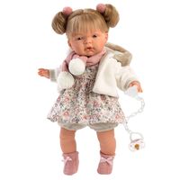 Wyprodukowana w Hiszpanii piękna lalka płacząca 38 cm marki Llorens jest wyjątkową zabawką dla każdego dziecka. Joel jest ubrana w kwiecistą sukienkę, białą kurtkę z futrzanym kapturem, różowy szalik z pomponem oraz różowe skarpetki z kokardkami. Lalka ma śliczną, delikatną buzię, granatowe oczęta i blond włoski z grzywką spiętą w dwie kiteczki z pomponami. Jest przeuroczą dziewczynką, która swoją urodą zachęci każdego do zabawy. Brzuszek lalki jest wypełniony miękką wyściołką, dzięki czemu idealnie nadaje się do przytulania. Do lalki dołączony jest smoczek, który pełni ważną funkcję. Po zabraniu lalce smoczka, będzie ona płakać i wołać mama, papa jak prawdziwe dziecko. Lalka została zapakowana w ozdobny karton. Kochamy hiszpańskie lalki Llorens!