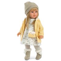 Laleczka Martina 54020 ma 40 cm i wykonana jest z delikatnego, przyjemnego w dotyku winylu. Jej miękki brzuszek wypełniony jest wyściółką. Lala ma niebieskie oczka z wklejonymi rzęsami oraz długie, proste włosy z grzywką w kolorze blond. Martina ubrana jest w uroczą białą sukienkę z szaro-brązowymi kwiatkami, elegancki, żółty płaszczyk z kapturkiem i białe rajstopki. W komplecie jest także żółta torebeczka wykończona białym misiem oraz dzianinowa, melanżowa czapeczka i buciki z lamówką z misia, pomponami i kokardkami.