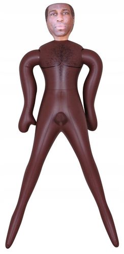 Czarna, męska lalka miłosna z twardym penisem, ciasnym otworem odbytu, nadrukowaną twarzą, ciemnymi włosami i nadrukowanymi włosami na piersi. Nadmuchiwana do naturalnej wielkości. Materiał: PCV.