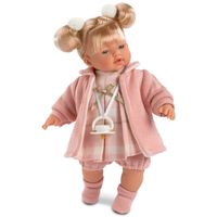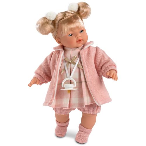 Hiszpańska lalka Paula 33298 ma 33 cm i wykonana jest z delikatnego, przyjemnego w dotyku winylu. Jej miękki brzuszek wypełniony jest wyściółką. Po wyjęciu smoczka Paula zapłacze i powie "mama, papa". Lala ma niebieskie oczy otwarte na stałe oraz półdługie, proste włosy z grzywką w kolorze blond. Włoski są związane w dwa kucyczki frotkami z białymi pomponami. Paula ubrana jest w doskonałej jakości, elegancką, kraciastą sukienkę do kolan, w kolorze różowo-białym, z kremową kokardką. W komplecie znajdują się także dzianinowy, elegancki, różowy płaszczyk oraz skarpetki i krótkie pantalonki.
