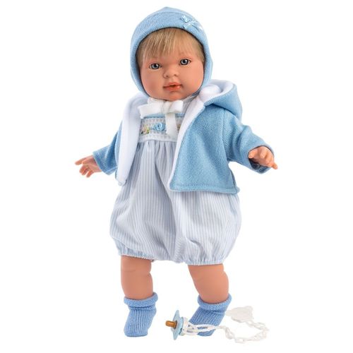 Wyprodukowana w Hiszpanii piękna lalka płacząca 42 cm marki Llorens jest wyjątkową zabawką dla każdego dziecka. Miguel jest ubrany w błekitny rampers z haftami, skarpetki, niebieską bonetkę i kurtkę z futrzanym kapturem. Lalka ma śliczną, delikatną buzię, niebieskie oczęta i blond włoski z grzywką. Jest przeuroczym chłopcem, który swoją urodą zachęci każdego do zabawy. Brzuszek lalki jest wypełniony miękką wyściołką, dzięki czemu idealnie nadaje się do przytulania. Do lalki dołączony jest smoczek, który pełni ważną funkcję. Po zabraniu lalce smoczka, będzie ona płakać i wołać mama, papa jak prawdziwe dziecko. Lalka została zapakowana w ozdobny karton. Kochamy hiszpańskie lalki Llorens!