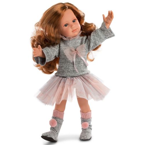 Laleczka Sophia 54206 z serii Exclusive ma 42 cm i wykonana jest w całości z delikatnego, przyjemnego w dotyku winylu. Lalka stworzona jest w nowoczesnej technologii, posiada przegubowe kończyny i głowę, co umożliwia jej wykonywanie ruchów w każdą stronę! Ponadto lalka samodzielnie stoi. Sophia ma niebieskie oczy z wklejonymi rzęsami oraz długie, rude, lekko kręcone włosy. Ubrana jest w modny, szary sweterek z różowymi, tiulowymi wykończeniami i kokardką oraz różowo-szarą, wielowarstwową, tiulową spódniczkę. Eleganckim uzupełnieniem są szare, dzianinowe kozaczki wykończone różową lamówką i pomponem.