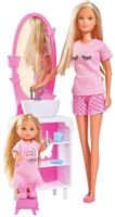 Lalka Steffi ubrana jest w różową piżamkę, składającą się z krótkich spodenek w grochy i koszulki oraz klapki japonki, Evi natomiast ma na sobie koszulkę nocną i różowe kapcie. Dodatkowo w zestawie znajduje się szafka łazienkowa wyposażona w duże lustro (w którym faktycznie można się przeglądać), zlew z kranikiem i 3 półeczki, a dzięki dołączonym akcesoriom takim jak: stołek dla Evi, kubeczek czy szczoteczka do mycia zębów, lalki będą mogły przygotować się do snu.