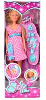 Przyszła mama z niemowlakiem w brzuchu. Ubrana w letnią sukienkę ze wstążką. Zestaw zawiera akcesoria do pielęgnacji bobaska.