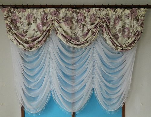 WZÓR ARABELLA Efektowny bardzo elegancki lambrekin i firana w kolorach na jasnym tle,fioletowe kwiaty i zielone liście, wielokolorowy wzór i biała firana. Uszyty z tkaniny zasłonowej, na taśmie marszczącej, wykończony satynową lamówką i białymi koralikami . Składa się z dwóch osobnych części lambrekinu i firany. Komplet na karnisz 2m. Szerokość lambrekinu po zmarszczeniu można regulować na taśmie w zakresie od 200 cm. do 230 cm. wysokość na środku wynosi 45cm. Firanka z białego woalu widoczna na poniższych zdjęciach szer 2 mb po zmarszczeniu, wysokość można regulować na taśmie. Cena dotyczy jednego lambrekinu