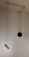 Lampa składa się z trzech czarnych kabli o długości 8m każdy, opraw na żarówki E27, metalowek puszki o średnicy 12 cm oraz czarnych metalowych uchwytów na kable.