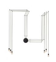 Lampa składa się z sześciu czarnych kabli o długości 8m każdy, opraw na żarówki E27, metalowej puszki o średnicy 12 cm oraz czarnych metalowych uchwytów na kable.