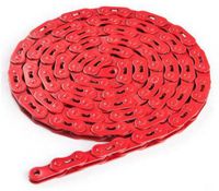 Mocny i bardzo lekki łańcuch 1-rzędowy. Do zębatki 1/8". Wszystkie ogniwa niklowane a w nowych wersjach kolorystycznych pokryte specjalną nano-powłoką o metalizowanym wykończeniu. Ażurowe ogniwa wewnętrzne i zewnętrzne. Drążone bolce. Długość: 102 ogniwa. Szerokość: 9,4mm. Waga: 320g. Odporność na rozciąganie: 12750N.