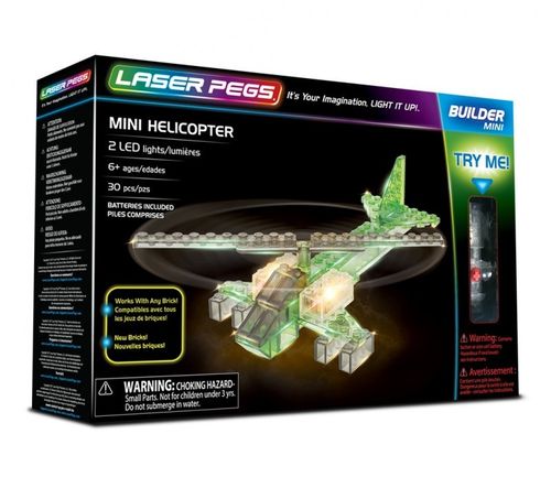 MINI HELICOPTERLatanie to świetna zabawa dla małych i dużych. Dzięki MINI HELICOPTER to także możliwość połączenia zamiłowania do podniebnych podróży z własnoręcznym konstruowaniem świecących pojazdów z klocków. W tym zestawie znaleźć można 30 wielokolorowych, półtransparentnych klocków, kostkę z diodami LED do podświetlania stworzonej konstrukcji, jak i ruchome śmigła urozmaicające dziecięcą zabawę. Kontroluj parametry lotu i obierz kurs na prawdziwą przygodę!Rozwijaj, baw się. LASER PEGS – to takie logiczne.Dlaczego warto?Czy świecące klocki mają coś wspólnego z matematyką? Oczywiście! Dziecko planując własną konstrukcję zupełnie nieświadomie dokonuje najprawdziwszej analizy wielu czynników, przypominającą algorytmy matematyczne. Rodzimy się z tym i albo te zdolności rozwijamy, albo o nich zapominamy. Czas, by dzieci poznały prawdziwą twarz matematyki: nie teoretyczną i nudną z książki czy komputera, ale rzeczywistą, namacalną i mega inspirującą. Zabawa świecącymi klockami LASER PEGS, to zapewnienie różnorodnego i twórczego spędzenia czasu, ale także utrwalenie logicznych mechanizmów myślowych. MINI HELICOPTER z LASER PEGS, to:- nowy moduł „TRY ME” umożliwia wypróbowanie zabawki bez otwierania pudełka, - w zestawie znajdują się baterie: 6 x LR 41 (1.5 V),- 30 kreatywnych klocków do samodzielnego złożenia, - dodatkowo nowa, podświetlana kostka i zestaw ruchomych śmigieł,- amerykańska zabawka wykonana z certyfikowanego i trwałego plastiku o wysokiej jakości,- stałe źródła światła (diody LED wystarczą na 100 000 godzin, czyli 11 lat zabawy),- produkty kompatybilne z innymi modelami LASER PEGS oraz innymi klockami wiodących marek,- zabawka do samodzielnej zabawy dla dzieci od lat 6,- szczegółowa instrukcja w zestawie, a także na stronie internetowej producenta www.laserpegs.pl,- nie tylko dla chłopców!Wiekod 6 lat