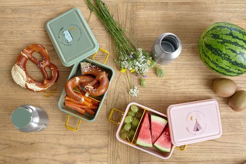 Pudełko śniadaniowe niemieckiej marki LASSIG przyda się nie tylko do szkoły, ale również podczas rodzinnych spacerów i wycieczek. Jest pojemne i posiada ruchomą przegrodę, dzięki której można je wygodnie podzielić na dwie części, np. większą na kanapki, a mniejszą na owoce, krojone warzywa czy inne przekąski. Pudełko jest szczelne (ma silikonową uszczelkę wokół pokrywki) i solidne, można je wygodnie zamknąć i otworzyć – za pomocą bocznych klipsów, uniemożliwiających samoczynne otwarcie. Ma ergonomiczny kształt. Zmieści się nawet do małego plecaka. Pojemnik ma jasnoróżowy kolor, a na wieczku grafikę, której głównym motywem jest ciemnoróżowy namiot typu tipi. Przegródka i zamknięcie są w kolorze musztardowym.