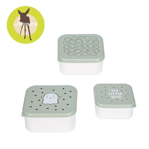 Komplet trzech kwadratowych snackboxów niemieckiej marki LASSIG, wykonanych z wysokiej jakości plastiku. Są lekkie i pojemne, w trzech poręcznych wielkościach: 8,5 x 8,5 x 4,5 cm, 10 x 10 x 5 cm oraz 11,6 x 11,6 x 5,5 cm, idealnych do przechowywania i przenoszenia posiłków w porcjach, odpowiednich dla dziecka. Można je włożyć jeden w drugi, dzięki czemu zajmują mało miejsca przy przechowywaniu. Pudełka są białe, a ich pokrywki – w pastelowym odcieniu oliwki, z motywem jednego dużego lub wielu mniejszych przyjaznych duszków, oraz napisem i wzorem w czarne trójkąciki (w zależności od wielkości pudełka).