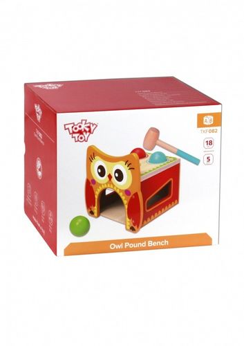Ławeczka z wizerunkiem sowy ma deseczkę z 3 otworami, przez które za pomocą drewnianego młotka wbijamy kule. Każdy z otwór ma obwódkę pasującą do koloru kuli. Dzięki temu maluszek uczy się rozróżniania kolorów.