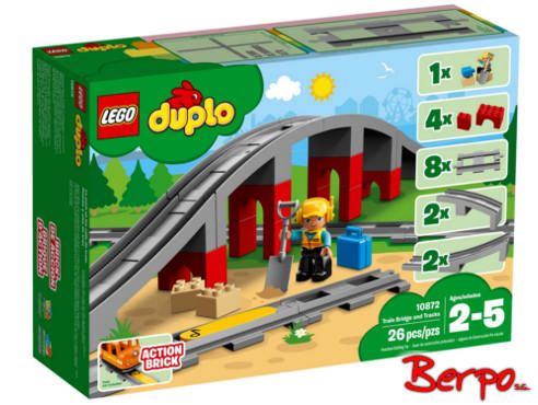 Dodaj zestaw LEGO® DUPLO® 10872 Tory kolejowe i wiadukt do dowolnego z nowych lub istniejących zestawów kolejowych DUPLO, by wspomóc rozwój pierwszych umiejętności konstrukcyjnych swojego dziecka. Maluszek może budować wysoki wiadukt i układać tory na różne sposoby. Pomóż mu także ustawić żółty klocek funkcyjny na torach, a przejeżdżające nad nim zgodne pociągi DUPLO odegrają sygnał dźwiękowy. W zestawie znajdziesz figurkę pracownika budowy LEGO DUPLO, dwa klocki luzem, łopatę i walizkę, które ułatwią zabawę i opowiadanie historyjek.