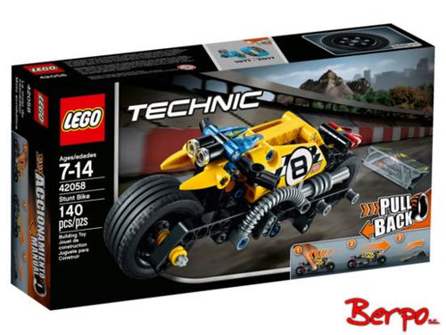 Odlotowy kaskaderski motocykl LEGO® Technic zabierze Cię na przejażdżkę życia! Ta pomalowana w ostry, żółto-czarny wzór maszyna ma naklejki z wyścigową szachownicą, światła z przodu i z tyłu, fajne rury wydechowe i wyjątkowo szerokie koła z niskoprofilowymi oponami, które gwarantują doskonałą przyczepność i równowagę. Uruchom potężny silnik typu pull-back, a motocykl jak strzała popędzi po pochylni i wykona niesamowite ewolucje.