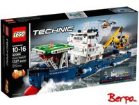 Wielki statek z zestawu Badacz oceanów LEGO® Technic zabierze Cię na pełne morze! Ten granatowo-biało-czerwony model ma szczegółowo odtworzony kadłub z gruszką dziobową i dwoma odbijaczami, duży mostek kapitański, dźwig, lądowisko, a nawet łódź podwodną i helikopter! Ster statku porusza płetwy sterowe, luk w pokładzie daje dostęp do wnętrza kadłuba, a działający dźwig pozwala opuścić łódź podwodną na wodę. Wolisz latanie? Zakręć wirnikami helikoptera i w drogę! Gdy nabierzesz ochoty na nowe wyzwanie konstruktorskie, możesz zamiast tego modelu zbudować pchacz i barkę.
