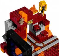 - Znajdziesz tu krajobraz Netheru z gry Minecraft™ z portalem, płomieniami, grzybami i funkcją lawospadu — wszystko do złożenia z klocków, a do tego wózek kopalniany i zakręcający tor.