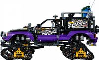 Sprawdź niezwykłą przyczepność i manewrowość tego ekstremalnego pojazdu z czterema terenowymi gąsienicami i działającym zawieszeniem, podnoszonymi drzwiami i opuszczanymi stopniami bocznymi, podnoszonym namiotem dachowym, działającą wyciągarką, przednim układem kierowniczym, otwieraną maską, szczegółowym silnikiem V8 z ruchomymi tłokami i zamykaną tylną klapą. Model ma również wysuwaną szufladę bagażową, dwa boczne schowki z apteczką i dwiema gaśnicami oraz bagażnik na dachu z dwoma kanistrami w rzadkim, ciemnozielonym kolorze. Ten zestaw LEGO® Technic 2 w 1 z dekoracyjnymi naklejkami składa się z żółtych, czarnych i fioletowych elementów i można go przebudować na mobilną bazę.