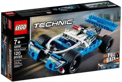 Uruchom napęd typu pull-back i rozpocznij dynamiczny pościg radiowozem z zestawu LEGO Technic Policyjny pościg! Radiowóz zbudowany jest z niebieskich, białych i czarnych części oraz ozdobiony policyjnymi naklejkami. Wyposażony jest w czerwono-niebieskiego koguta, aerodynamiczny zderzak z przodu, duży spojler z tyłu oraz przyczepne, niskoprofilowe opony z szerokimi, czarnymi felgami. Można połączyć go z pojazdem typu pull-back z zestawu 42090 Monster truck złoczyńców, by urządzić niezapomniany wyścig samochodowy lub zbudować niesamowitą terenówkę kombi.