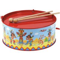 Bębenek metalowy średnicy 20 cm i wysokości 9 cm. Bebenek z motywem Indian. W zestawie są dwie drewniane pałeczki. Przeznaczony dla dzieci w wieku od 3 lat.