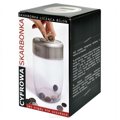Na nakrętce skarbonki znajduje się czytnik, który automatycznie identyfikuję monetę i jej wartość. Po wrzuceniu monety wyświetli się jej wartość na ekranie LCD, po czym ekran wyświetli łączną kwotę pieniędzy znajdującą się w skarbonce.