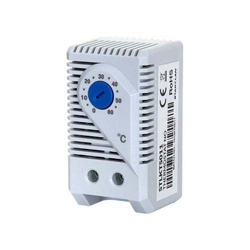 STLKTS011 to termostat typu NO, który zamyka układ zasilania w wyniku przekroczenia ustawionej temperatury. Przeznaczony jest do montażu w układzie wentylacyjnym szaf teleinformatycznych. Zakres regulacji temperatury wynosi od 0 do 60 st. Celsjusza.