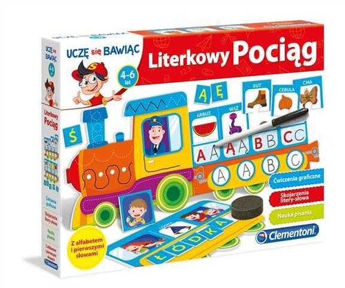 Ciuf! Ciuf! Zaczynamy podróż i odkrywanie literek!o Dzieci mogą pisać literki w każdym wagonie za pomocą specjalnego markera umożliwiającego wymazanie. Na końcu pociągu mogą przekładać zapisane kartoniki i układać je w dowolnej kolejności, bawiąc się słowami.o Zawiera duży pociąg, kartonowe elementy z literami, marker i gąbkę.